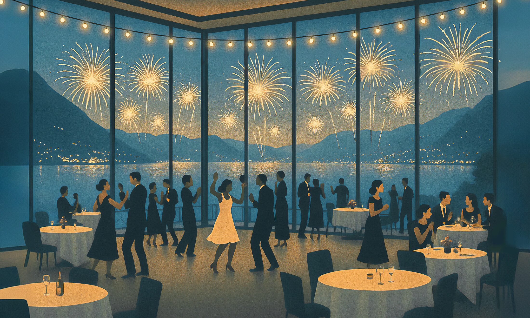 At around 11:30 pm, the artists unite in a crescendo leading into the countdown and midnight toast. To mark the passage, a dedicated corner offers cotechino and lentils – a traditional ritual elegantly revisited. At 12:05 am, the evening takes on a new form in the Lugano Room: the guitarist transforms into a DJ sound designer, and the vocalist becomes a captivating live singer, igniting the dance floor until 3:00 am.